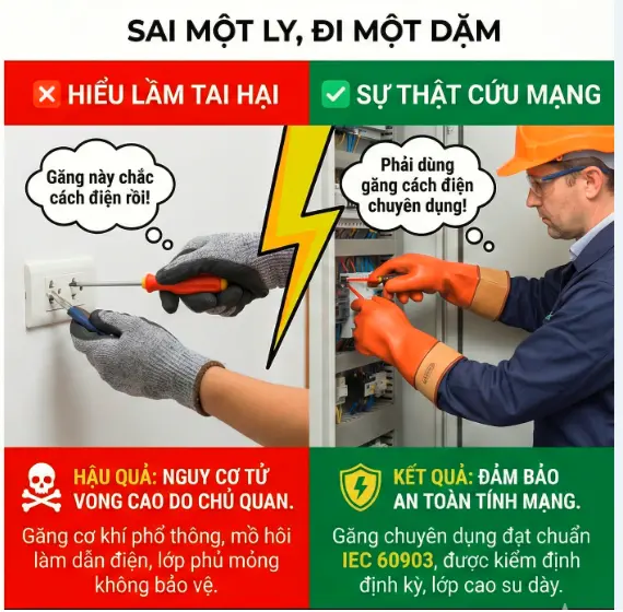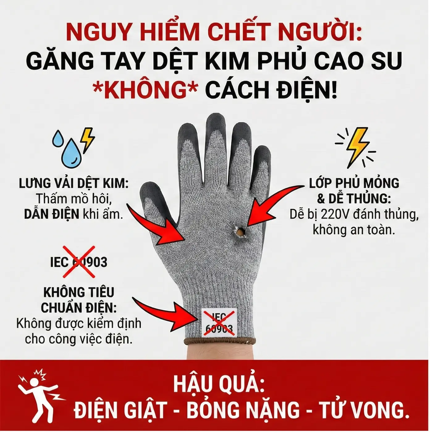 “Găng dệt kim phủ cao su có thể giúp bạn chống trượt – nhưng không bảo vệ bạn khỏi điện giật”. Chỉ găng cách điện đạt chuẩn IEC/TCVN, được kiểm định định kỳ, mới đáng tin cậy khi làm việc với điện.